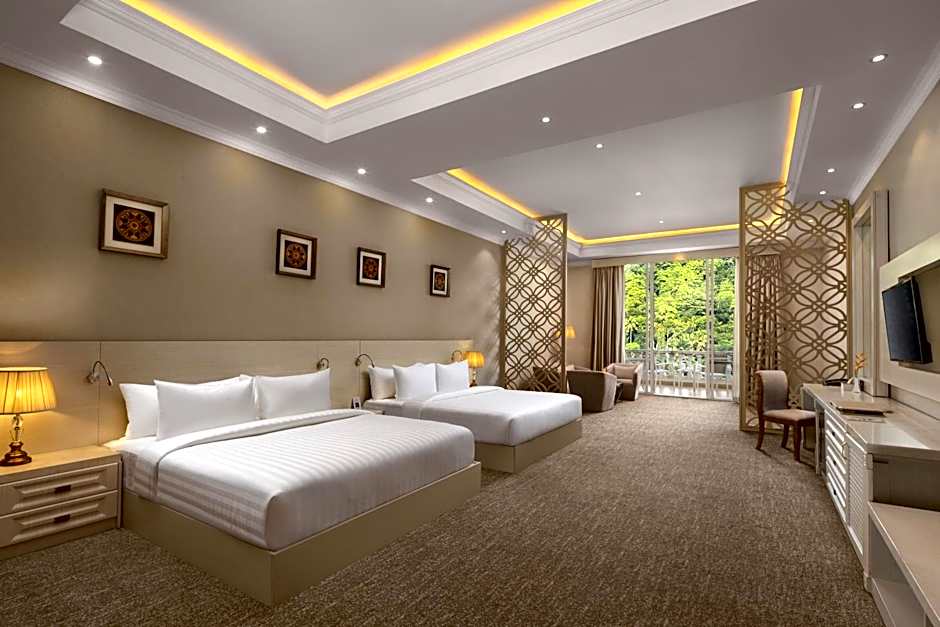 The spacious twin/double room features air conditioning, a mini-bar, a balcony with garden views as well as a private bathroom boasting a walk-in shower.